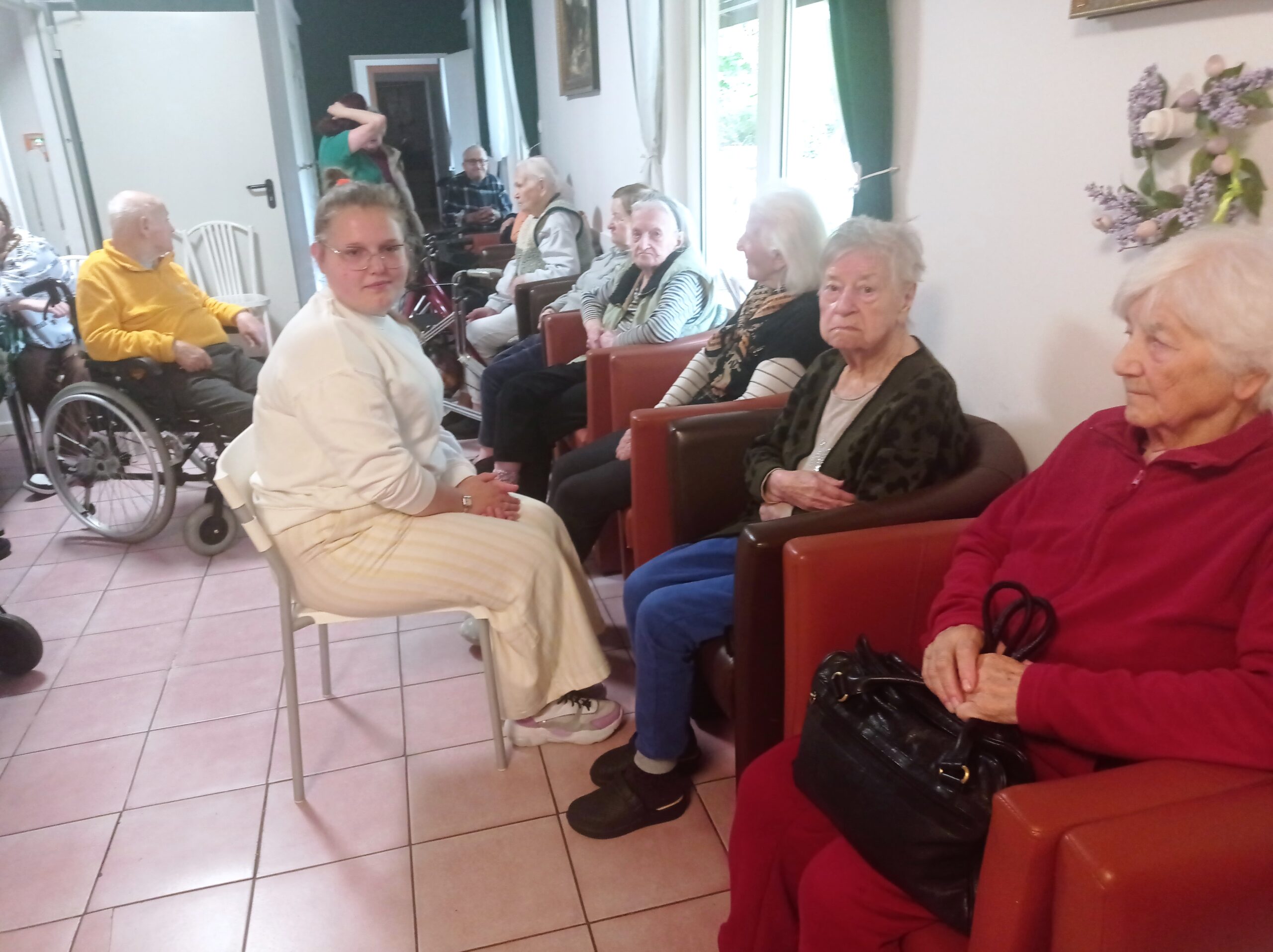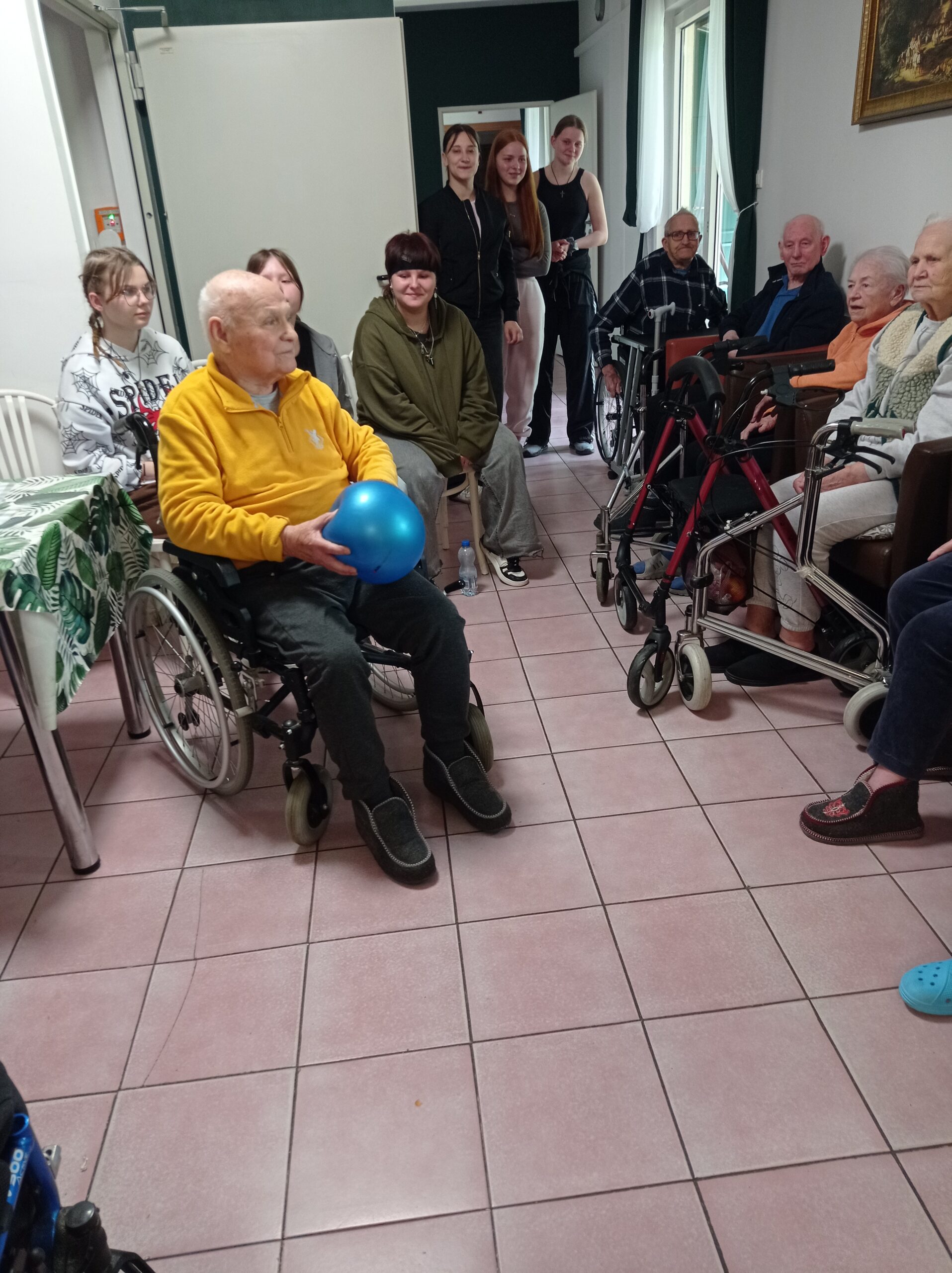 Podczas ostatniego spotkania nie zabrakło również zabawy – dziewczęta wraz z seniorami zorganizowały prostą grę z użyciem piłki. Wspólne odbijanie i łapanie piłki sprawiło wszystkim mnóstwo radości i śmiechu. Choć to może wydawać się drobnostką, dla osób starszych ma ogromne znaczenie – jest formą ruchu, zabawy, ale przede wszystkim – bliskości.